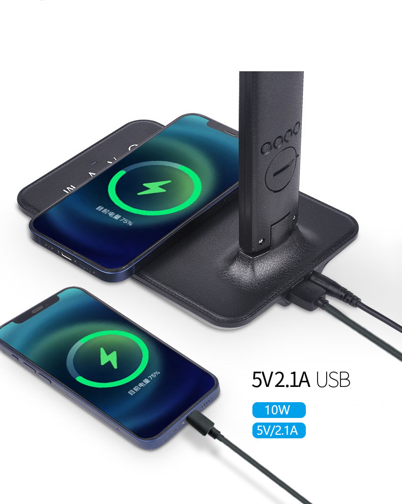 - USB-порт для Зарядки. Кроме беспроводной зарядки, лампа также оснащена USB-портом для подключения устройств через кабель. Удобно заряжайте свои гаджеты прямо рядом с рабочим пространством.